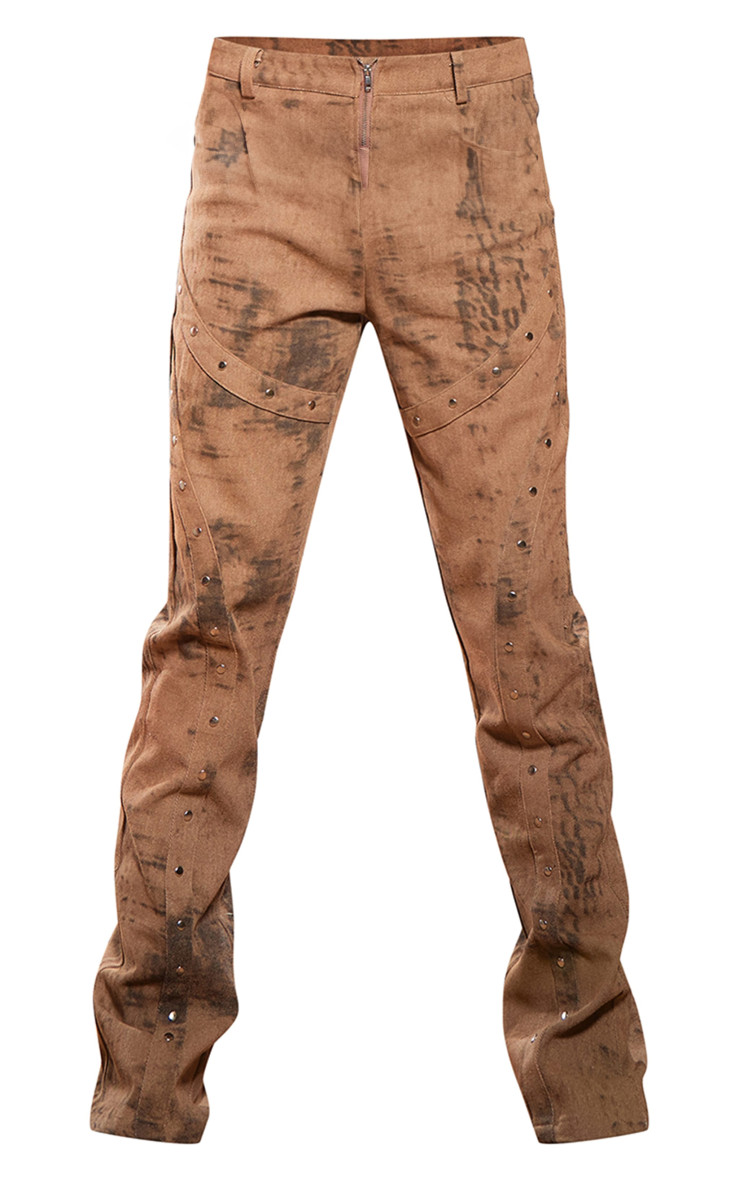 Коричневі розкльошені джинси з кльошами кислотного кольору