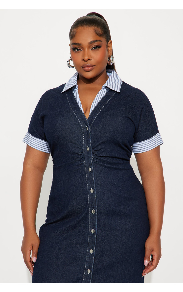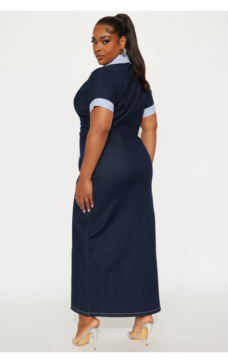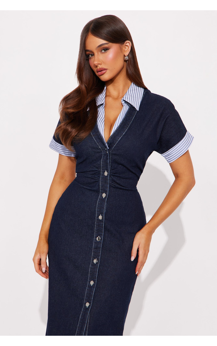 Шикарна максісукня з деніму з короткими рукавами та коміром. Делікатний пінстрайп-контраст додає вишуканості, а ґудзики спереду та розріз підкреслюють силует. Тканина має еластичність для вашого комфорту. Через особливий процес фарбування, можливе осипання барвника, тому рекомендується прати окремо від інших речей. Склад: основна тканина – 75% бавовна, 23% поліестер, 2% спандекс; контрастна тканина – 45% бавовна, 45% поліестер, 10% віскоза. Імпортний виріб.