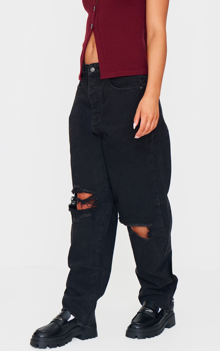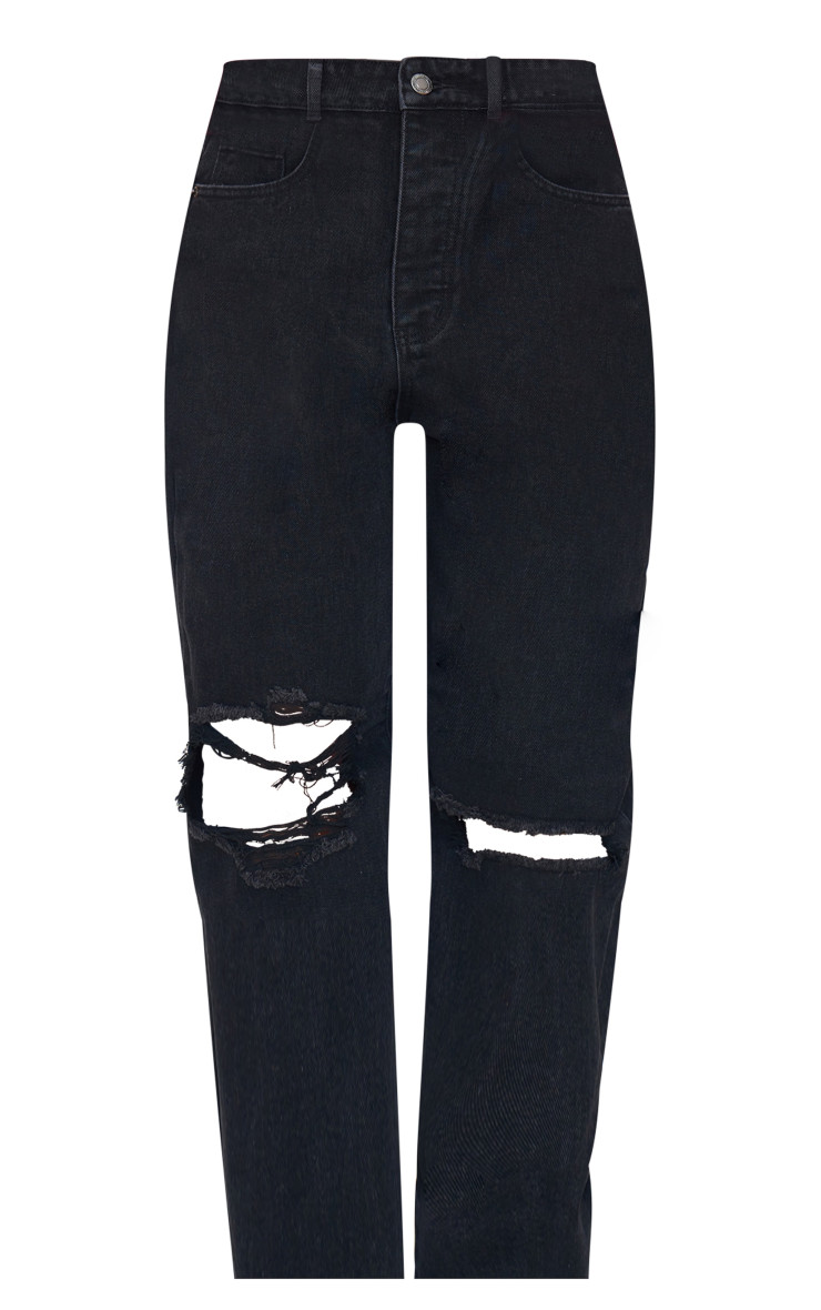 Випрані чорні джинси-бойфренди з екстремальним рваним подолом PRETTYLITTLETHING